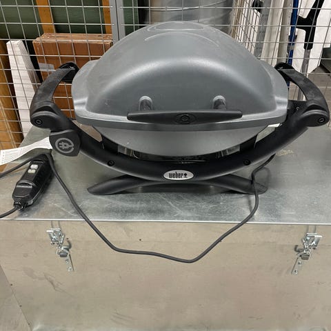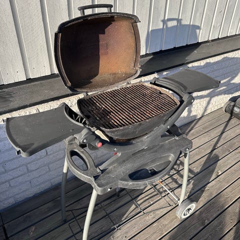 Weber Q gasolgrill med stativ. Grillen har lock och chassi i vit och mörk plast/metall samt två sidobord i plast. Den står på ett fristående stativ med två hjul för enklare förflyttning. Grillgallret är i gjutjärn och grillen ansluts till gasol via slang. Passar för utomhusgrillning på altan, uteplats eller i trädgård.
