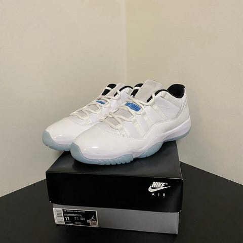 Air Jordan 2 retro sneakers i storlek 45. Skorna är vita med blå detaljer och har snörning framtill.