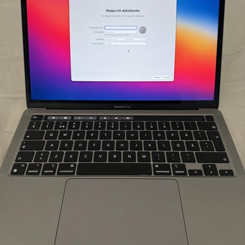 Datorn är i mycket fint skick och fungerar felfritt. Det finns en liten fläck på skärmen (se bild), men den är knappt synlig vid vanlig användning och påverkar inte funktionen.