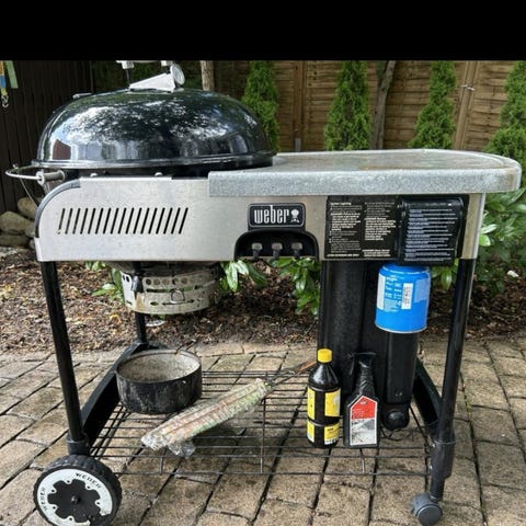 Weber Q gasolgrill med stativ. Grillen har lock och balja i gjuten aluminium samt två sidobord. Grillgallret är i gjutjärn och grillen är utrustad med hjul på stativet för enklare förflyttning. Passar för utomhusgrillning på altan eller uteplats. Ett överdrag till Weber Q ingår, anpassat för grillen på stativ. Finns att hämta i Båstad