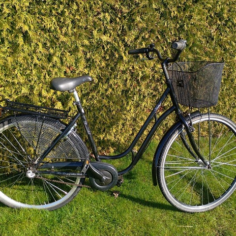 Ortler damcykel med ramstorlek M och 28" hjul. Utrustad med framkorg och stöd. Nytt bakdäck och slang. Normalt glapp och slitage finns men den rullar och bromsar bra.