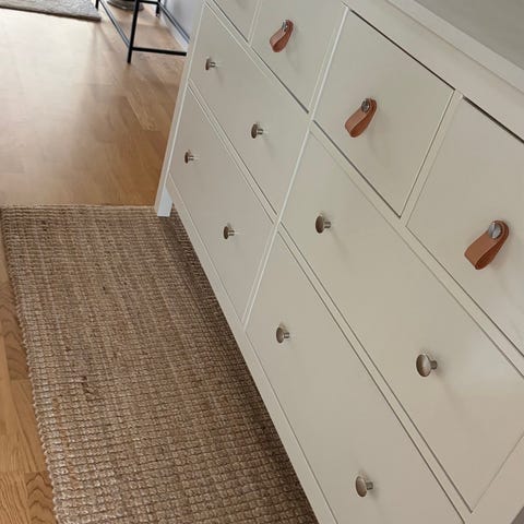IKEA byrå vit med sex lådor. Byrån har två sektioner med tre lådor i varje, vilket ger gott om förvaringsutrymme för kläder, textilier eller andra saker i hemmet. Framsidorna är släta och utrustade med handtag i läderlook. Passar exempelvis i sovrum, hall eller vardagsrum som förvaringsmöbel eller som avlastningsyta mot vägg.