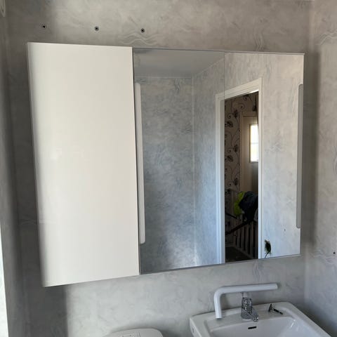 Badrumsmöbel bestående av väggmonterad kommod med integrerat tvättställ och matchande högskåp i träutseende. Kommoden har rundad front med lådor och ett infällt handfat med blandare. Högskåpet har flera luckor och lådor med handtag för förvaring.