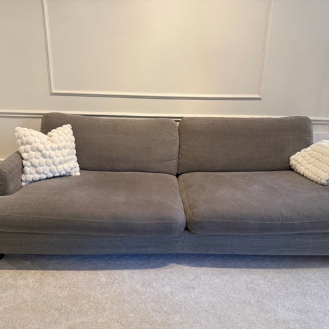 Skicket: I använt men fint skick. Det syns några ljusare streck på sittdynornas tyg. Ett litet hål på stommens överdrag (upptill på ryggen, se bild), men inget som syns framifrån då ryggkuddarna går över stommens rygg. Nytvättade kuddfodral, bara stommen överdrag kvar om man vill ha allt nytvättat.