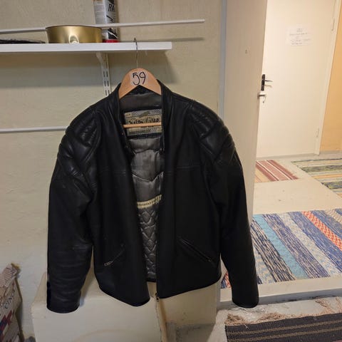 Harley-Davidson regnställ med jacka och byxa. Setet är i svart och grått med Harley-Davidson-logotyp på ryggen av jackan. Materialet är ett regn- och vindskyddande tyg som bärs utanpå vanliga kläder. Passar för motorcykelkörning eller annan utomhusaktivitet i regnigt väder. Nypris 2400:-.