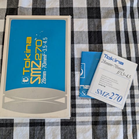 Tokina RMC 28mm f/2.8 kamerobjektiv med manuell fokus. Fast brännvidd på 28 mm och största bländare f/2.8. Objektivet har bländarring och avståndsskala markerad i meter och fot. Främre objektivlock ingår enligt bild. Passande kamerafattning framgår inte av informationen och behöver kontrolleras av köparen.