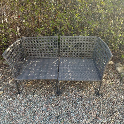 Ikea Jutholmen 2 delar, för utebruk. Sektionen har stomme i metall med flätad sits och rygg. Mått/modul ca: bredd 63 cm, djup 74 cm, höjd 71 cm. Sitsbredd 63 cm, sittdjup 63 cm, sitthöjd 31 cm (måtten är ungefärliga, baserade på produktbild). Till sektionen hör sitt- och ryggdynor: Ikea Kuddarna, för utomhusbruk. Passar som fristående sittplats eller som del i en större Jutholmen-soffgrupp på altan, balkong eller uteplats. Inköpt april -26 ihopmonterad men ej använd. (insåg att det blev lite för trångt på liten balkong). Nypris ca 2100
