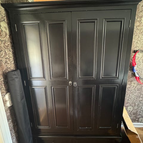Vackert välvårdat skåp. Tudelat, två dörrpar med bakomliggande hyllor. H175, B114, D44. Obs! Varumärke är oklart.