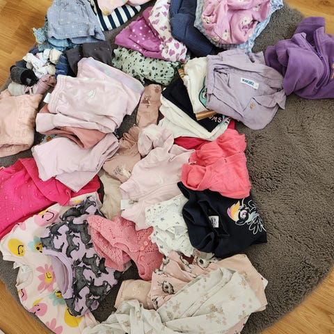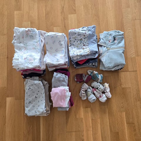 Nästan helt nya kläder, vissa aldrig använda och vissa använda 1-2 gånger. Jättefina kläder. Pyjamas, sets, bodys med olika motiv och byxor.