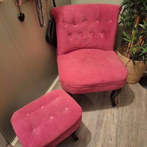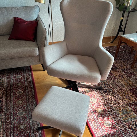 Snygg bekväm välvårdad fåtölj med handtag och medföljande fotpall. Nypris 3500.
