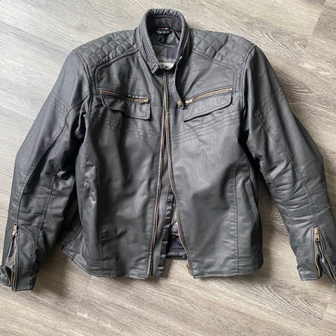 Motorcykelställ med jacka, byxor och handskar i svart färg. Stället har vadderade och förstärkta partier vid armbågar, axlar och knän samt reflexdetaljer på armar och rygg för ökad synlighet. Jackan har dragkedja framtill och justerbara ärmslut. Byxorna är långa och anpassade för motorcykelkörning. Handskarna är långa, svarta motorcykelhandskar med förstärkningar i handflata och knogar samt justerbar stängning vid handled. Passar för motorcykelåkning i varierande väderförhållanden.
