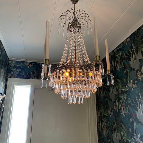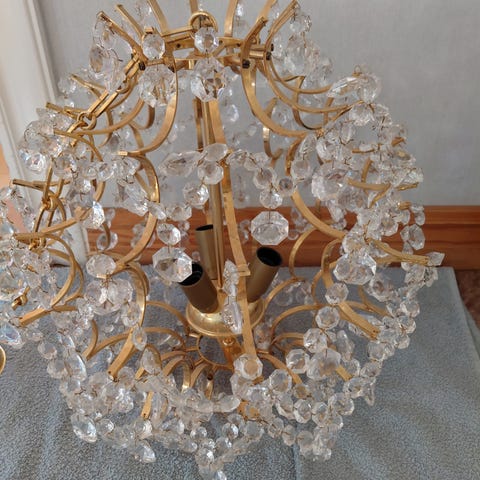 Kristallkrona i fin modell, lite mindre sort. Höjd ca 43 cm exkl sladd. Ca 30 cm i diameter. För avhämtning i Piteå.
