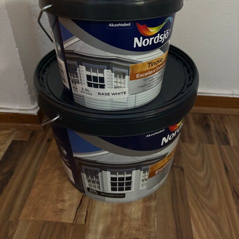 Nordsjö Original metallfärg, två burkar à 2,5 liter. En burk i kulören svart och en burk Base White (vit bas). Färgen är avsedd för målning av metall och levereras i plåtburkar med handtag. Lämplig för användning på olika metallunderlag där täckande yta önskas. Märkt AkzoNobel och specificerad som metallmålning på etiketten.