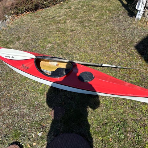 Fin kajak med paddel och avtagbar sits, går väldigt stadigt på vattnet .