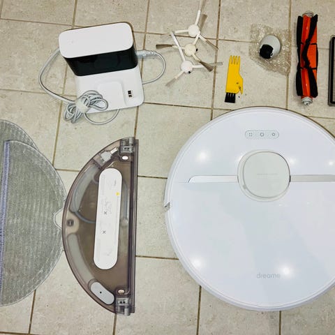Den kommer med en basstation för att kunna ladda och tömma dammsugarens innehåll samt en avtagbar vattenbehållare för att moppa golvet med.