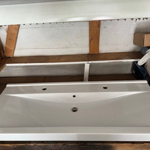 Bath Deluxe Viden tvättställ 120 cm dubbel i vit färg. Tvättstället har två rektangulära hoar med varsin blandarplats och bräddavlopp. Bredden är 120 cm och djupet cirka 46,5 cm enligt förpackningsbilden. Avsett för montering på kommod eller bänkskiva i badrum. Levereras i originalkartong enligt bilderna.