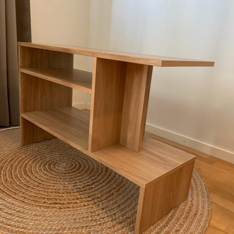Säljer en mångsidig och stilren möbel i ekmönstrad finish. Den fungerar utmärkt som ett sidobord eller en lägre bokhylla för att skapa ordning och reda.