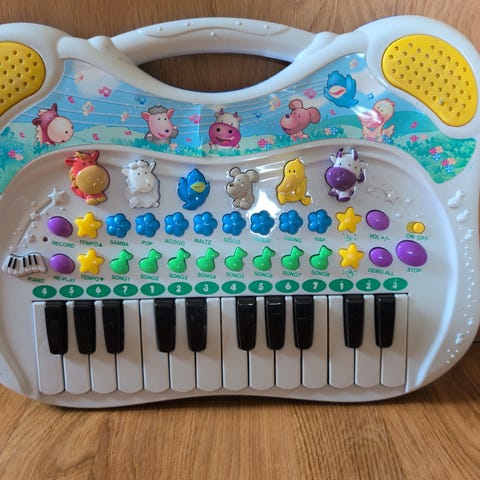 Leksakspiano samt med olika djurläten.