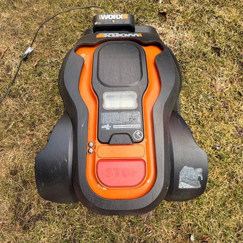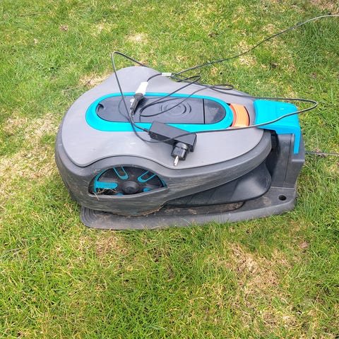 Robotgräsklippare i kompakt modell med orange och svart hölje. Klipparen är av model med gränstråd. (Medföljer ej). Appstyrning för schema läggning.