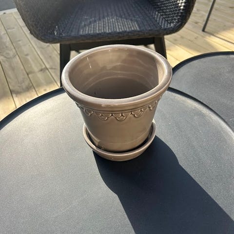 En vacker terrakottakruka med Fleur de Lys-motiv.