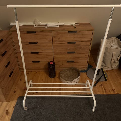 Klädstång RIBBA från IKEA bortskänkes pga har köpt garderob nu.. Denna fungerar men är vinglig och om man har en bok under ena foten så blir den stabil. Går säkert att laga men jag är inte så teknisk så jag har kört på den enkla lösningen med boken…