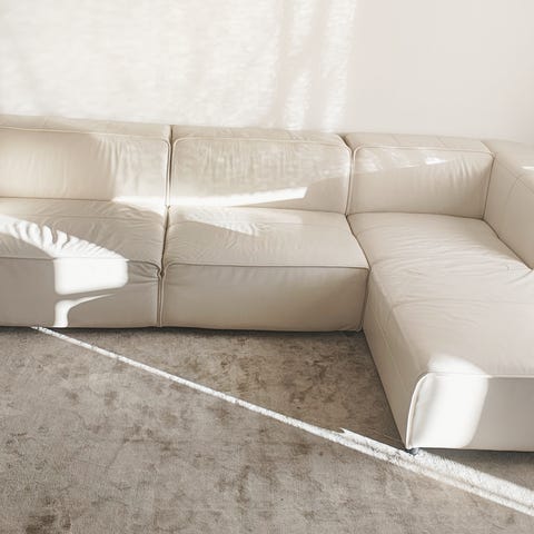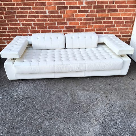 Säljer en mycket fräsch och modern L-formad divansoffa i vitt konstläder (skinnimitation). Soffan är rymlig, väl omhändertagen och i mycket gott skick. Materialet är slitstarkt och väldigt enkelt att torka av.