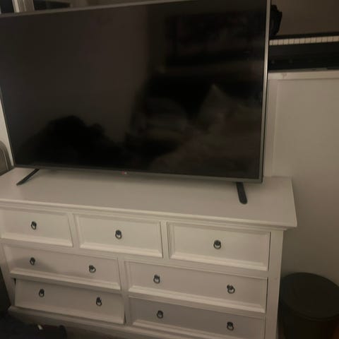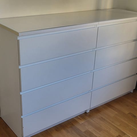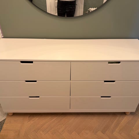 Säljer min stora vita byrå då jag ska flytta. Alla lådorna är väldigt smidiga och låter ingenting. Det är inga yttre synliga skador på den. Det enda som är är en skruv i en av skenorna inuti som jag har fått tejpa fast med silvertejp. Men detta syns inte alls om man inte tar ut lådan och det påverkar inte funktionen av skenan alls!