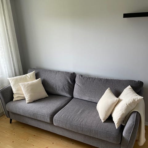 2-sitssoffa (ny) + fotpall, 5 kuddar & extra madrasser