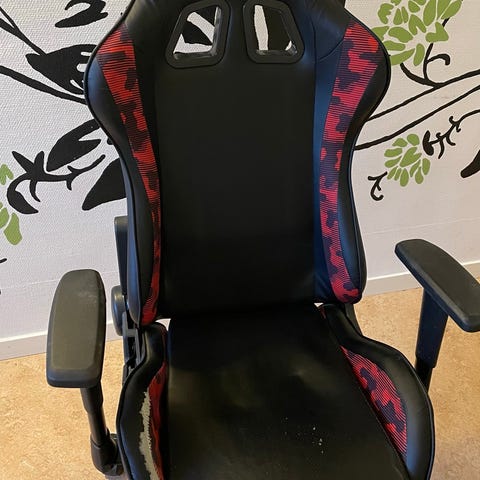 Gamingstol i röd och svart färg med hög rygg och justerbara armstöd. Stolen har hjul och snurrfunktion samt sits och ryggstöd utformade för längre sittperioder vid datoranvändning eller spel. Passar för användning vid skrivbord eller gamingstation.