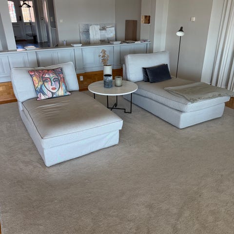 Avtagbart tyg som går att tvätta i maskin. Sofforna har varit i ett djur och rökfritt hem. Sparsamt använda.