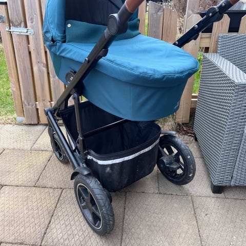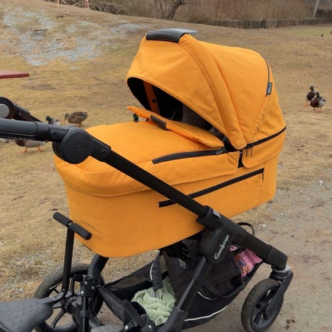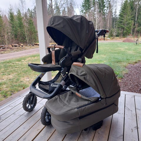 Tyger i mycket fint skick. Tvättat parfymfritt nu inför att den ska få flytta. Ventilation i suffletterna, sittplatta i liggdelen, magnetsele, vändbar sittdel som har fullt liggläge.