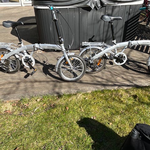 Två hopfällbara cyklar säljes. 7 växlar inbyggt i navet. Kabellås och bygellås medföljer. Tygväskor för transport finns också.