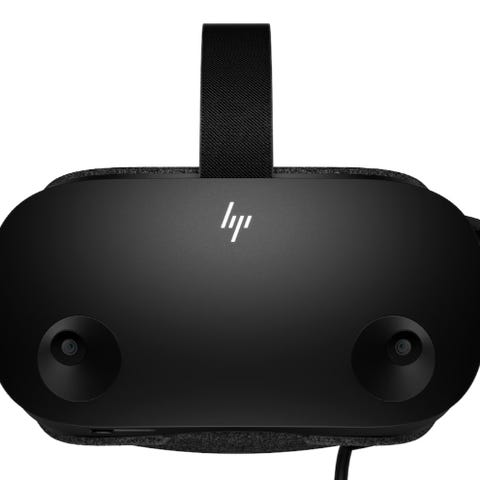 HP Windows Mixed Reality VR‑headset med två handkontroller. Headsetet är svart med blå detalj och ansluts med kabel till dator. Handkontrollerna har styrspakar, knappar och spårningsring för rörelsestyrning. Systemet är avsett för virtuell verklighet på PC med stöd för Windows Mixed Reality och kan användas för spel, simuleringar och andra VR‑applikationer.