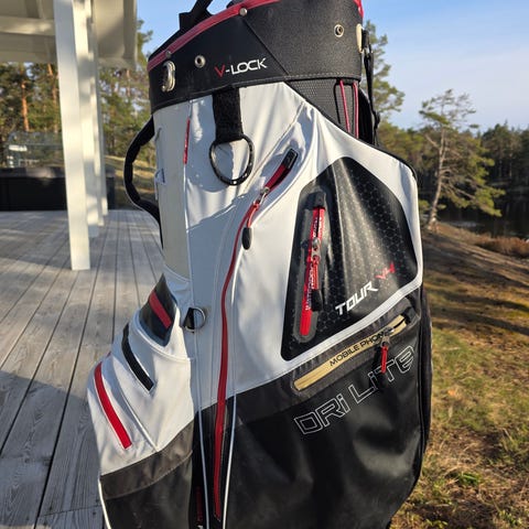 Big max golfbag i svart färg. Väskan har flera fack för klubbor med individuella avdelare upptill samt flera ytterfickor med dragkedja för förvaring av bollar, handskar och annan golfutrustning. Bagen är utformad för användning på golfvagn eller golfbil och har bärhandtag upptill för enkel hantering.