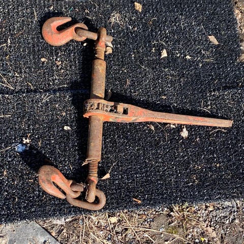Båttillbehör med flera ankare, kätting, tampar och åror.