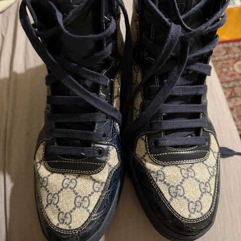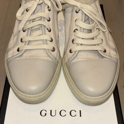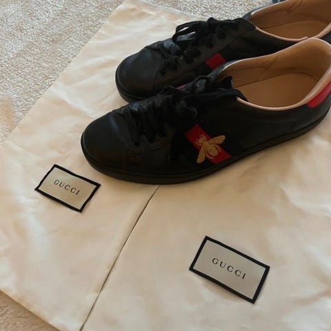 Hej, säljer en par funktionella sneakers ifrån Gucci. Skorna har slitningar men som har fixats av en skomakare. Allt som ses på bilden medföljs vid köp. Skorna har en del år på nacken men nu pris var runt 9000+. Skriv gärna vid frågor eller funderingar!