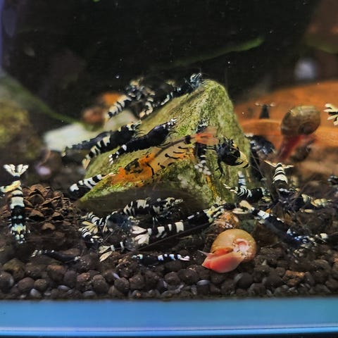 Det finns snäckor i akvariet som rensar alger och överbliven mat. Vill du ha med några kan jag lägga till (sandsnäckor, posthorn eller blåssnäckor).