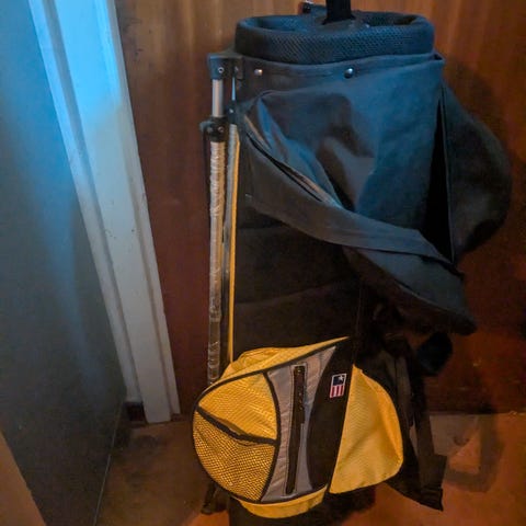 Bagen är i väldigt bra skick och har flera fickor för bollar, peggar och tillbehör. Regnskydd ingår.