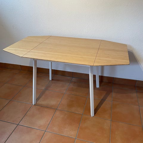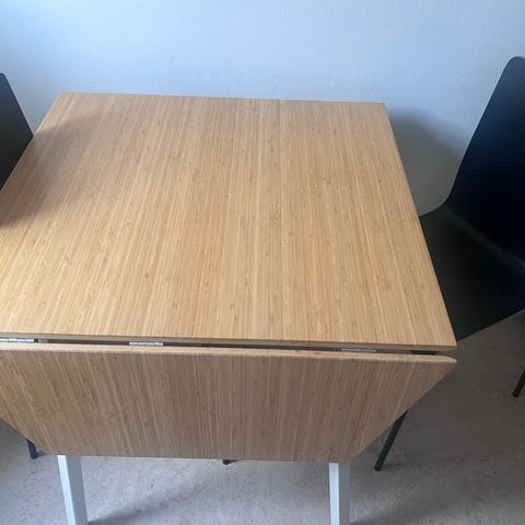 Säljer vårt klaffbord IKEA PS 2012 i bambu med vita ben. Bordet är i gott skick – enda skadan är på ett hörn som syns på bild 3.
