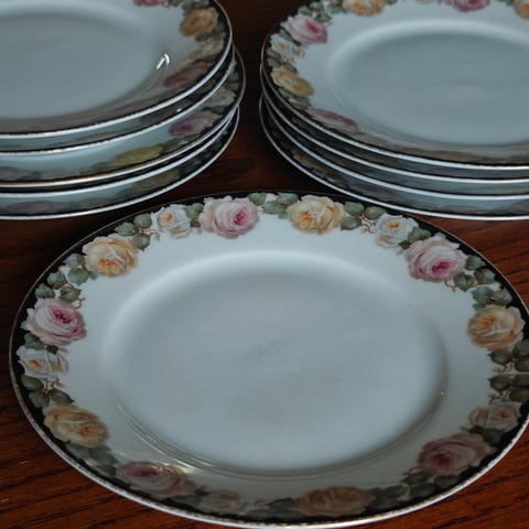 Enligt uppgift tidigt 1900, blanka med fin lyster och utan skärvor. En har en ytlig spricka i glasyren och därför en svar missfärgning längs sprickan. Visst slitage på guldkanten (naturligt pga åldern). Diameter 18cm. Tillverkare okänd och har varit min mormors men det är fullt i skåpen och något måste jag släppa. Prisat som 15:-/st för de tre och 0:- för den med svag missfärgning.