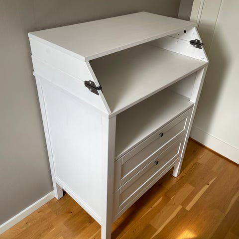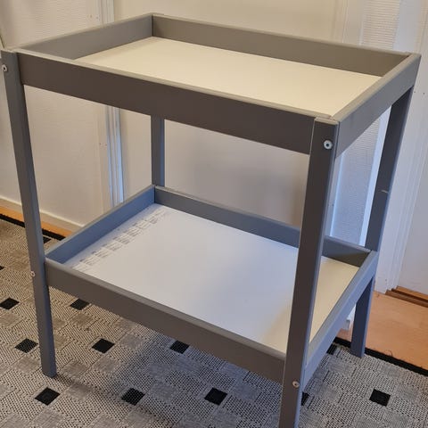IKEA skötbord med öppen förvaring. Skötbordet är vitt och har en skötbädd upptill samt två öppna hyllplan undertill för förvaring av blöjor, kläder och andra tillbehör. Passar för skötsel och ombyte av spädbarn och småbarn i hemmet.