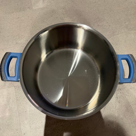 Stekpanna/kastrull i rostfritt stål med tillhörande lock. Handtaget och knoppen på locket är blå.