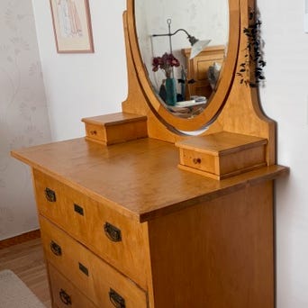 Spegelbyrå/hallmöbel med oerhört potential. Bara att slipa upp ytan något och måla den i någon fin färg.