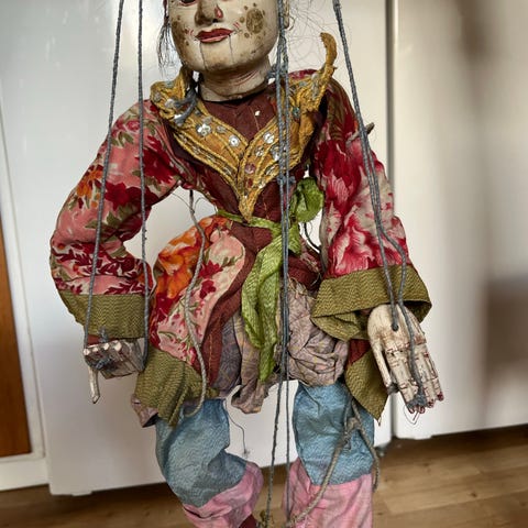 Handgjord tedocka i tyg med mönstrade blå och gyllene textilier. Figuren är rikt dekorerad med band, pärlor och blommor i textil. Passar som prydnad och dekoration i hemmet.