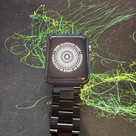 Apple Watch Series 3 smartklocka med boett i aluminium och rött idealofsweden sportarmband i silikon. Klockan har pekskärm och pulssensor på baksidan. Medföljer magnetisk laddkabel med USB‑anslutning. Lämplig för vardagsanvändning, notifieringar och aktivitetsmätning. Passar handled med justerbar storlek via hålen i armbandet.