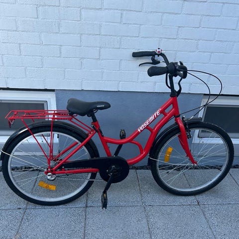 Lila färg med rosa detaljer, lågt insteg, pakethållare bak, korg fram, stänkskärmar, kedjeskydd, fotbroms bak, handbroms fram, fotstöd samt ramlås med nyckel. Väldigt fin i skicket, passar för vardagscykling.