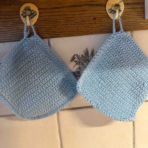 Handgjorda virkade mormorsrutor i två färger: mörk blå och ljus blå. Rutorna är kvadratiska och består av klassiskt mormorsrutemönster. Passar till exempel som delar i större projekt som filt, kuddfodral, väskor eller andra virkade arbeten. Garnet är ett mjukt, medeltjockt garn. Antal rutor är 9 st. De är med ögonmått och fingermått ca 10x10 cm.