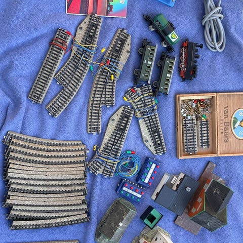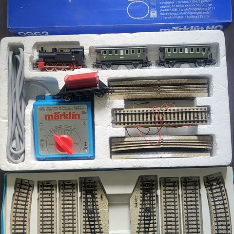 MÄRKLIN modelljärnväg tågset med flera lok, godsvagnar och personvagnar samt ett större antal rälsdelar i olika utföranden. I setet ingår raka och böjda rälsbitar, växlar samt en transformato. Vet inte vad som funkar. Endast transformatorn är testad och funkar utmärkt. Ett av loken har ingen släpsko. Växlarna är inte testade. Passar för uppbyggnad eller utökning av modelljärnvägsanläggning.