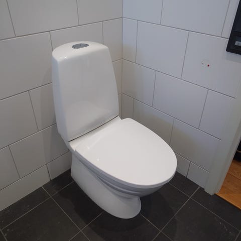 Vit toalettstol av märket IFÖ Cera med spolkant och spolknapp ovanpå cisternen med hel och halv funktion. 6/3 liter.