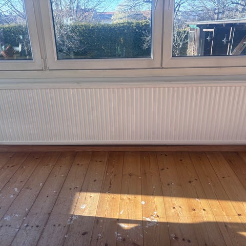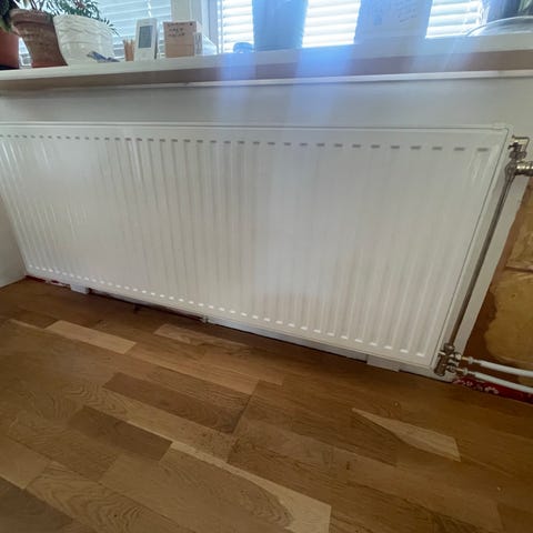 Vita elementradiatorer för vattenburen värme. Klassisk panelmodell med horisontella lameller och anslutningar i sidan.